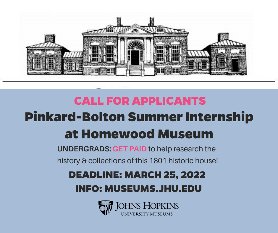 Undergraduate students with an interest in and experience with history, museums, and/or material culture are encouraged to apply for the 2024 Pinkard-Bolton internship at Homewood Museum.